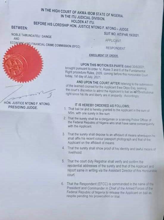 According to the street lawyer, a Bailiff from the State High Court, Itu division, Usen Ntem, was at the EFCC office to serve an Ex Parte Motion of the Court granting bail to his client on grounds of Fundamental Human Rights.
