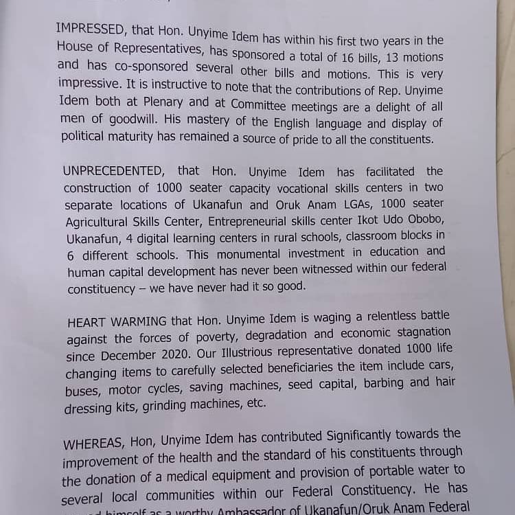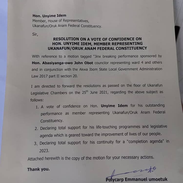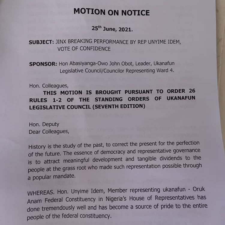 Ukanafun Legislative Council passes Vote of Confidence on Rep. Unyime Idem