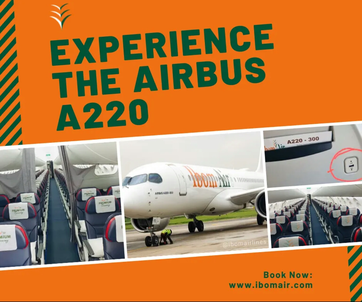Experience Ibom Air’s new Airbus A220. Enjoy added capacity, enhanced comfort and you can even charge your phones on board!