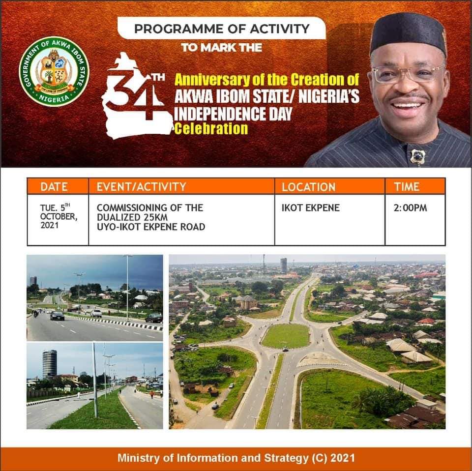 As part of events marking the 34th anniversary of Akwa Ibom State, The President of the Nigerian Senate, President Ahmed Ibrahim Lawan is billed to commission the dualized 25km Uyo-Ikot Ekpene Road on Tuesday, September 5, 2021.