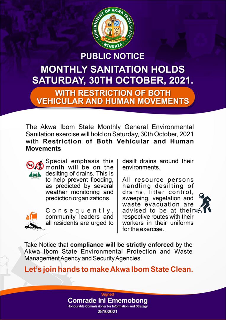 The Akwa Ibom State Monthly General Environmental Sanitation exercise will hold on Saturday, 30th October, 2021 with restriction of both vehicular and human movement.