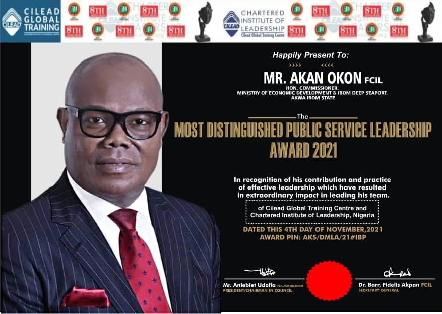 As a devout Christian and Community Leader, Akan has distinguished himself in promoting causes for the Church, community development and well-being of humanity. His philanthropy has earned him several dozens of excellence awards from the clergy, socio-cultural and political associations, few of which include an Award of Excellence in Leadership and Enterprise from the Redeemed Christian Church of God; Paul Harris Fellow from Rotary International; African Child Prize For Integrity And Professionalism from the African Child Foundation; Kwame Nkrumah Exemplary Leadership Award from the West African Students’ Union Parliament; Distinguished Service Award (DSA), The Association of Heads Of Federal Establishment (AHFE); Award of Excellence, 21st Century Icon Of Good Governance & Role Model To The Younger Generation, National Association Of Niger – Delta Students (NANDS); Award of Honour, IBEREDEM NAAKISS, National Association Of Akwa Ibom State Student’s (NAAKISS) Worldwide, Uyo Chapter and others.
