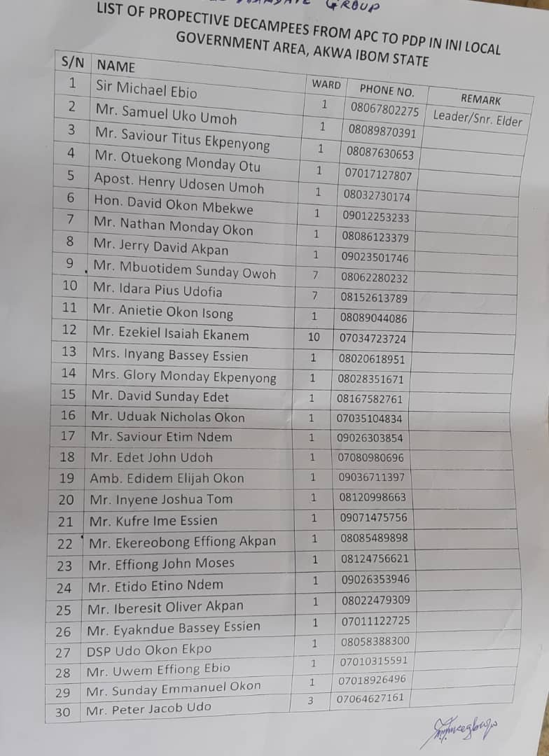In his remarks, the Ini PDP Chapter Chairman, Honourable Emmanuel Uma welcomed the legion of decampees to the fold of PDP and assured them that “the Umbrella is big enough to accommodate all of you”. He lauded Governor Udom Emmanuel for all he has done for Ini and reaffirmed the loyalty of his party faithfuls to Governor Udom and his succession plan.