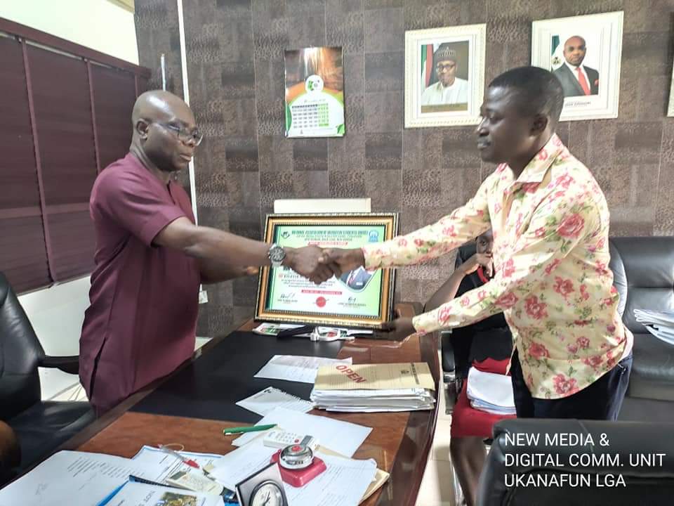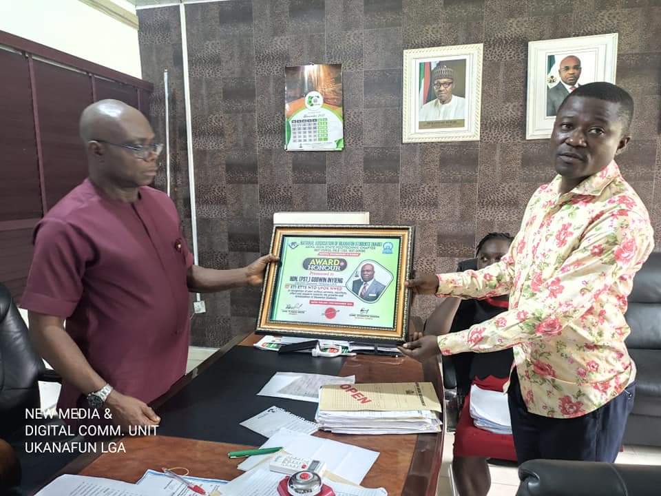 The Executive Chairman of Ukanafun LGA; Hon. Pastor Godwin Inyieng, was today presented with an Award of Honour for his selfless service, passion and commitment to the development of education and scholarship among the students community of the LGA, by the National Association of Ukanafun Students, Akwa Ibom State Polytechnic, Ikot Osurua Chapter.