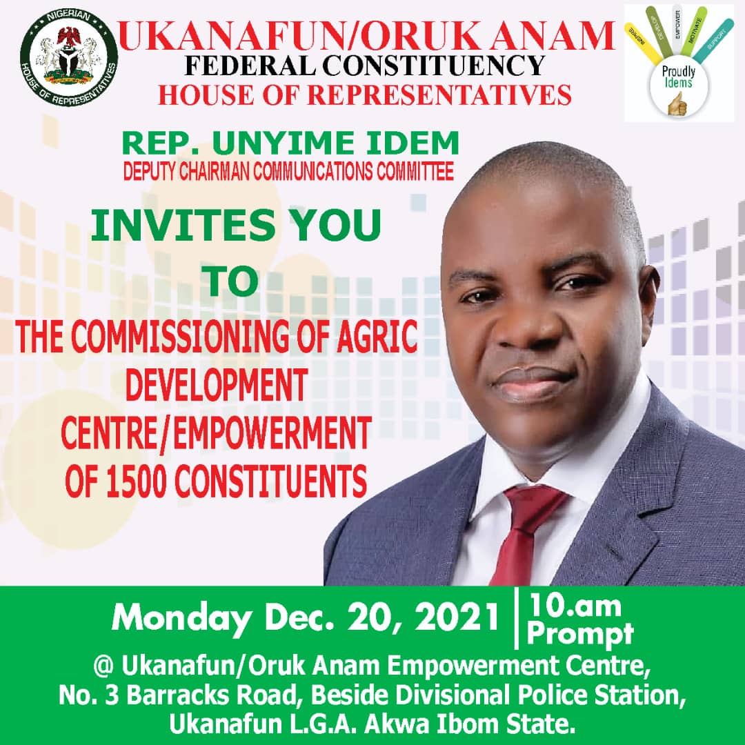 The Deputy Chairman House Committee on Communications and member representing Ukanafun/Oruk Anam Federal Constituency, Rep. Unyime Idem is set for his 2021 Constituency briefing and Empowerment of 1,500 beneficiaries. The release signed by the Ukanafun born Lawmaker also states that the 1000-seater capacity Agric Development Centre will be commissioned during the event.