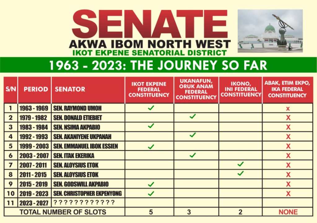 - We, therefore, stand with the decision of Ikot Ekpene Senatorial District Stakeholders earlier taken that come 2023, the Akwa Ibom North West (Ikot Ekpene) Senatorial District seat must go to Abak/Etim Ekpo/Ika Federal Constituency.