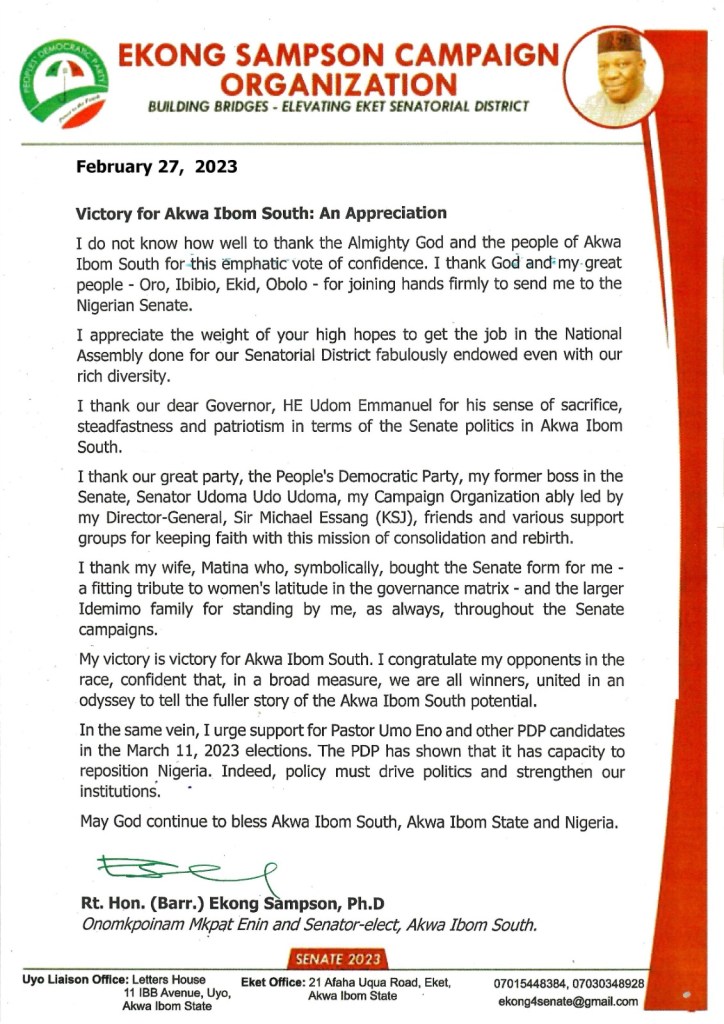 My victory is victory for Akwa Ibom South. I congratulate my opponents in the race, confident that, in a broad measure, we are all winners, united in an odyssey to tell the fuller story of the Akwa Ibom South potential.