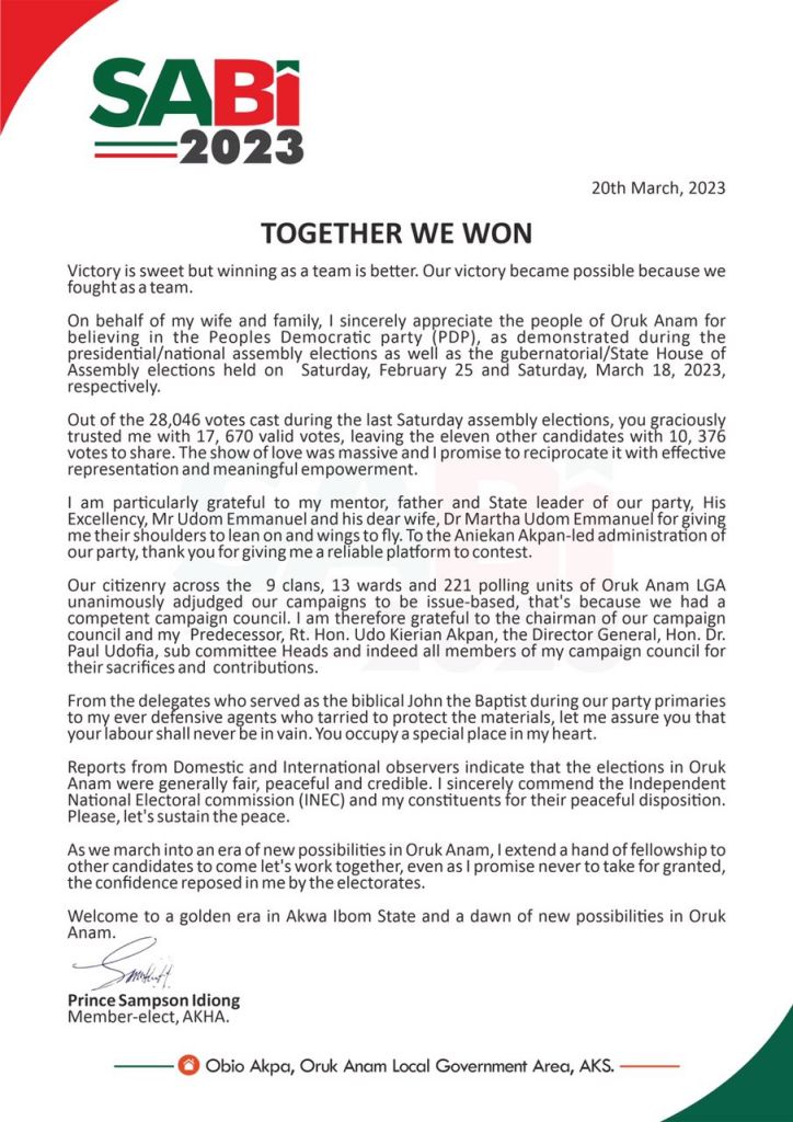On behalf of my wife and family, I sincerely appreciate the people of Oruk Anam for believing in the Peoples Democratic party (PDP), as demonstrated during the presidential/national assembly elections as well as the gubernatorial/State House of Assembly elections held on Saturday, February 25 and Saturday, March 18, 2023, respectively.