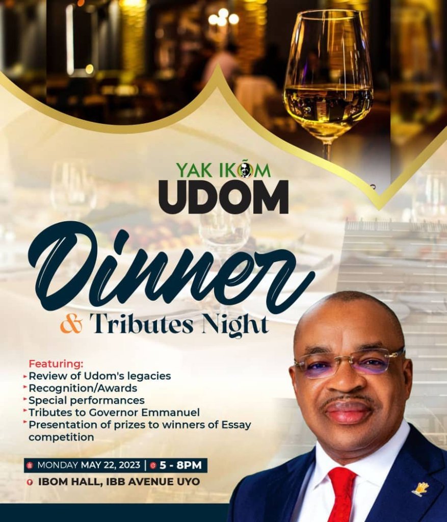As the clock ticks towards the dusk of this administration, a special dinner to celebrate Governor Udom Emmanuel’s eight years of superlative performance has been scheduled for Monday, May 22, 2023, at Ibom Hall, from 5p.m. to 8p.m.