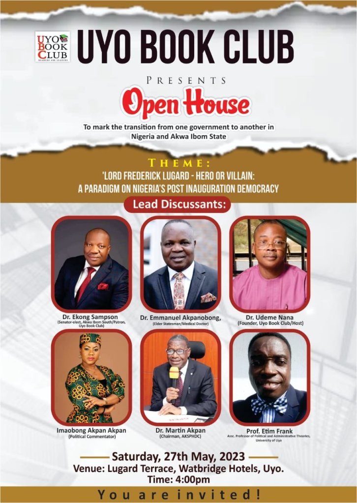 Among the eminent scholars and intellectuals to lead discussion include Dr. Ekong Sampson, Senator-elect, Akwa Ibom South/Patron, Uyo Book Club, Prof. Etim Frank, an Associate Professor of Political and Administrative Theories, University of Uyo and Dr. Emmanuel Akpanobong, elder statesman and a renowned medical practitioner.