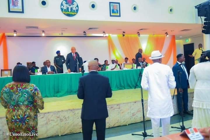At the inauguration, Deaconess Otobong Aaron and Hon. Oyosoro Oyosoro, former Vice Chairmen of Nsit Ibom and Urue Offong-Oruko, were sworn-in as Chairmen of their respective councils following the resignation of the former substantive Chairmen to contest elections into the House of Assembly, while Mr Mbosowo David and Arit Ambit took the oath as Vice Chairmen of the two local government councils respectively.