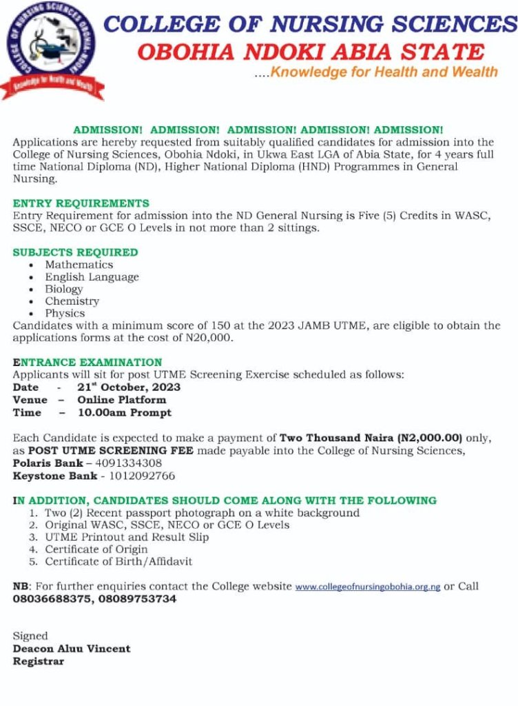Applications are hereby requested from suitably qualified candidates for admission into the College of Nursing Sciences, Obohia Ndoki, in Ukwa East LGA of Abia State, for 4 years full time National Diploma (ND), Higher National Diploma (HND) Programmes in General Nursing.