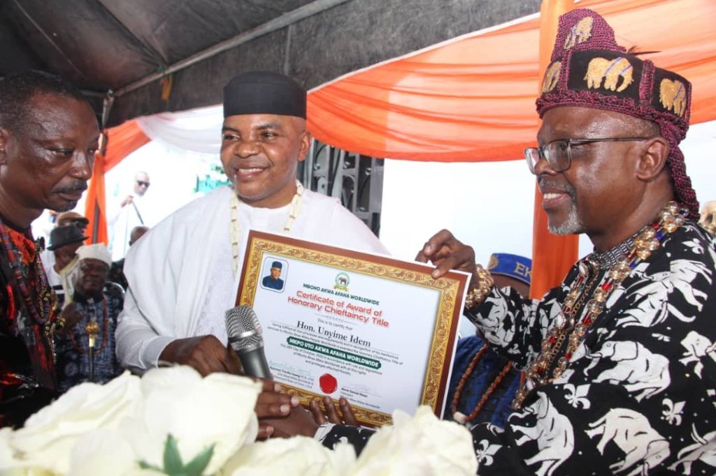 Idem was conferred the title by the Enin Akwa Afaha Worldwide and Paramount Ruler of Onna local government area, His Royal Majesty, Edidem Raymond Timothy Inyang, during the official commissioning of the International Secretariat of Mboho Akwa Afaha Worldwide in Uyo.