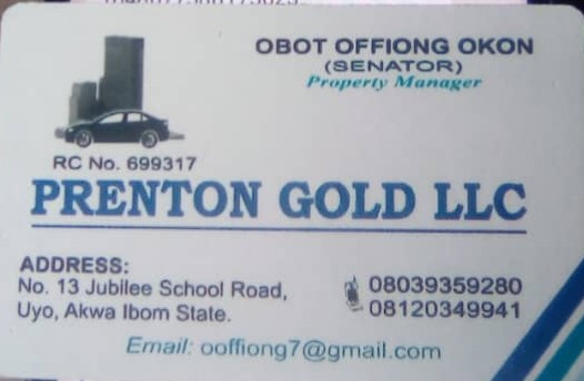 PRENTON GOLD LLC is located at No. 13 Jubilee School Road, off NEPA Line, Uyo, Akwa Ibom State. You can as well reach the Property Manager on 08039359280 or 08120349941.