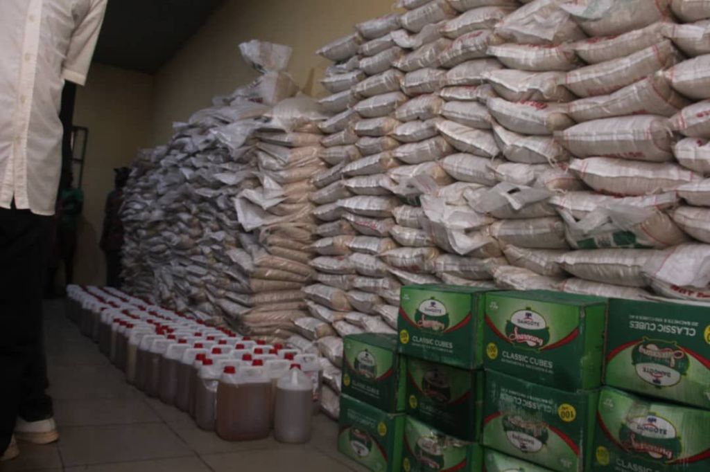 The items shared are 300 bags of rice, 300 bags of beans, 300 bags of garri, 300 cartons of vegetable oil, 40 cartons of tin tomatoes.